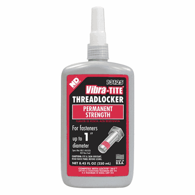 thread locking compound specially formulated to withstand shocks and vibrations that can cause fasteners to loosen over time. Vibra-Tite 131 boasts red thread lock strength, meaning that a large amount of torque, and/or heat, is required to break its strong adhesive bond. This anaerobic sealant will lock and seal fasteners up to 1" in diameter and perform well on aluminum, steel, plated, stainless steel and special alloy parts.